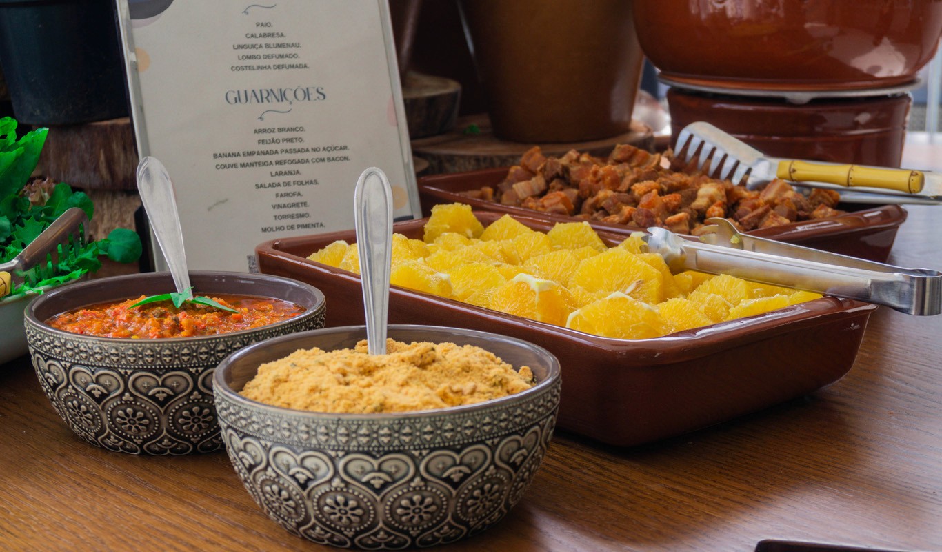 A nossa feijoada vem acompanhada de uma seleção de complementos que fazem toda a diferença. Servimos arroz fresquinho, farofa crocante, couve refogada no alho e laranja fatiada, para equilibrar os sabores e proporcionar uma experiência completa. A farofa, com seu sabor amanteigado e crocante, harmoniza perfeitamente com o feijão e as carnes, enquanto a couve refogada traz um toque de frescor e leveza ao prato. A laranja, com sua acidez, proporciona um contraste perfeito com o sabor intenso da feijoada.
